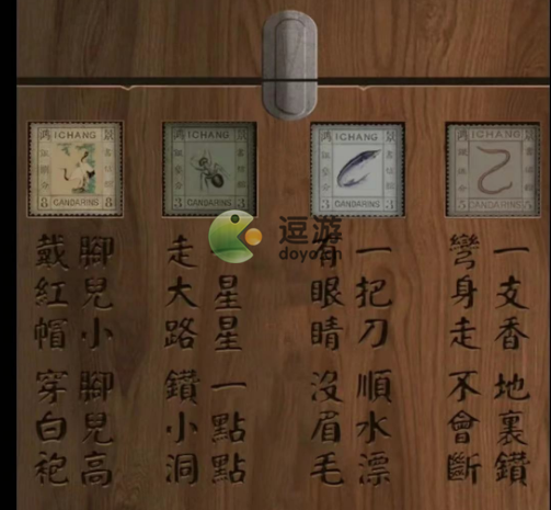 5、地上和桌上一共得到【四张邮票&金钱剑图画】,左边柜子箱子根据谜语放【邮票】
